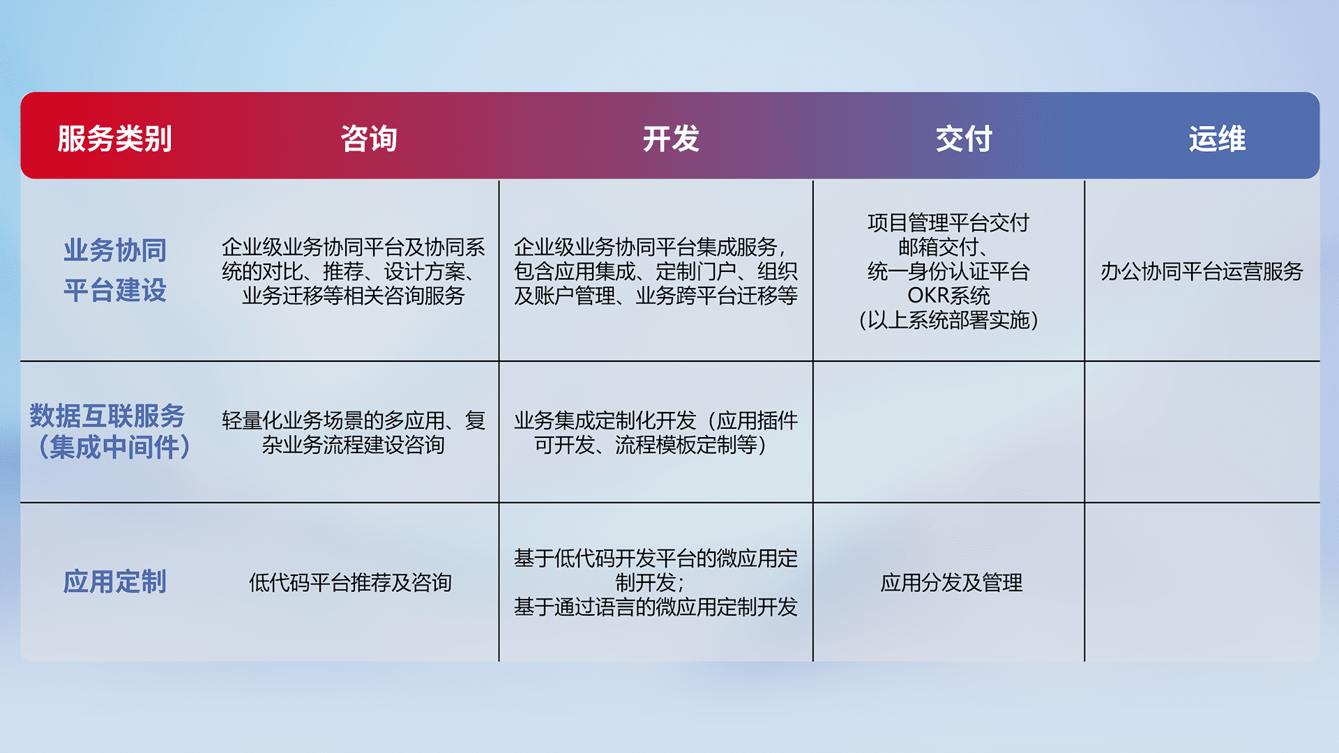 针对钉钉、、、、企微、、IDaas等平台级产品提供产品的规划、、、、方案、、交付、、、、定制化开发等服务,,实现如统一协同办公、、、、智能客户服务、、混合会议管理、、、智能数据查询、、、等业务场景,,,实现数字化转型。。。。